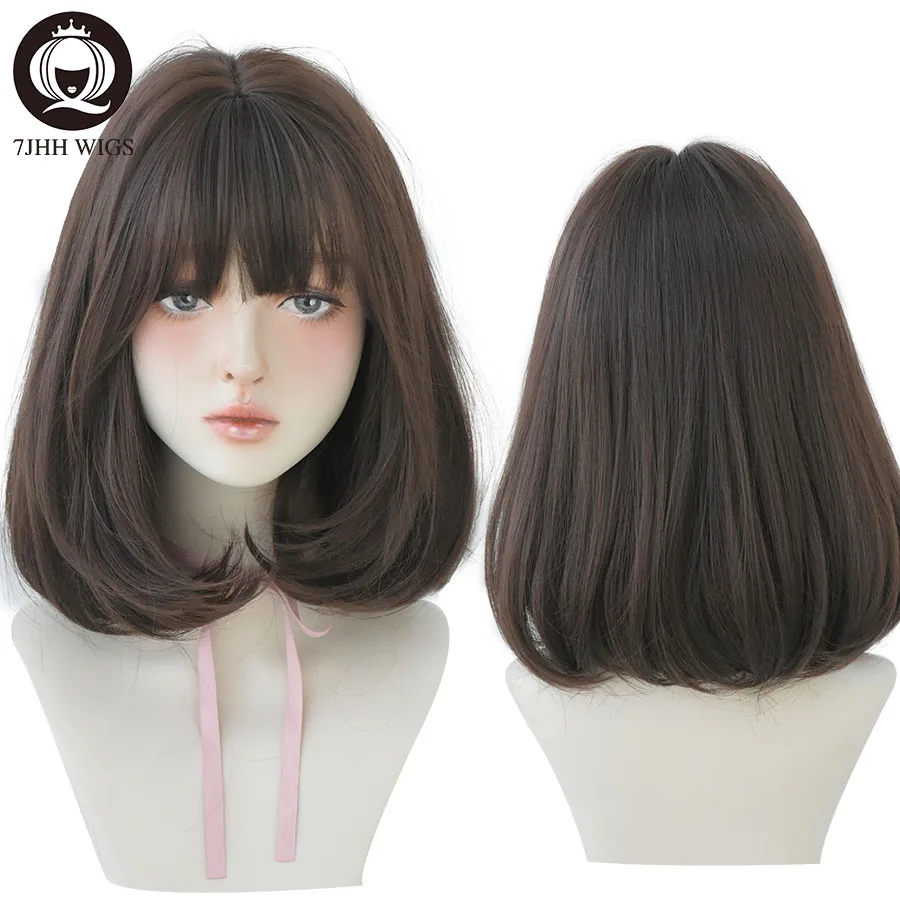 7JHH Pink Linen Short Straight Hair Lolita Wig With Bangs Synthetic Wigs For Women Christmas Cospla