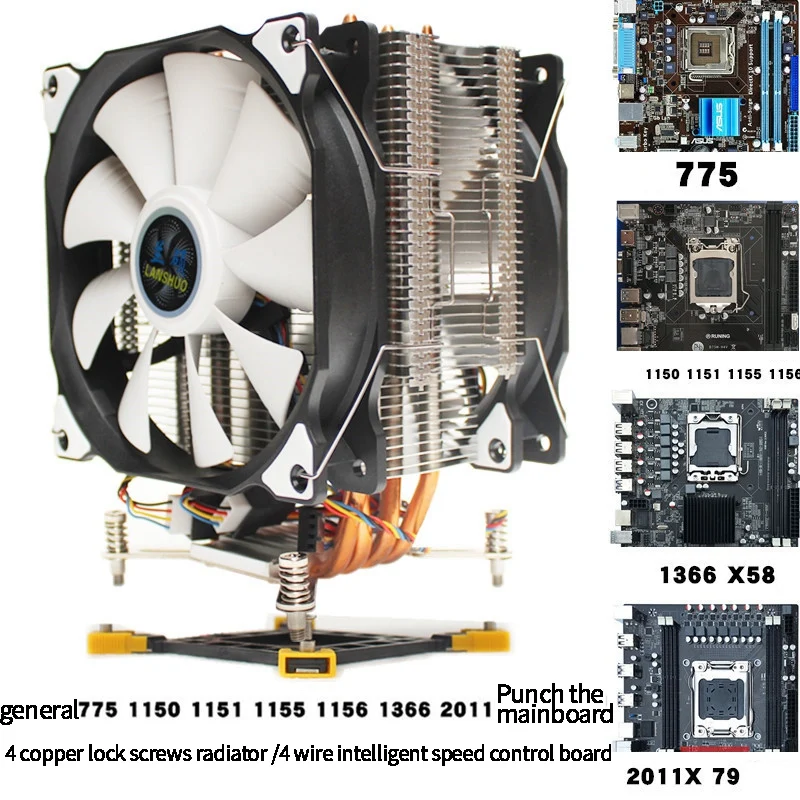 LANSHUO CPU Silent Dual Fan 4 Heat Pipe 4 Wire Intelligent Temperature Control CPU Cooler Fan for I